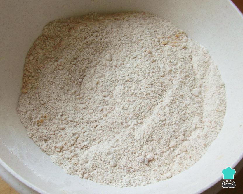 Primeiramente bata a farinha flocão no liquidificador até ficar mais fina. Coloque num bowl e misture com a farinha de trigo e o açúcar.