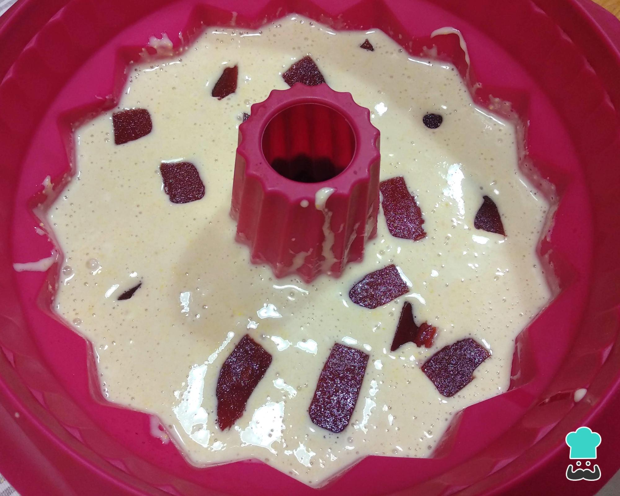 Por fim coloque o fermento e mexa um pouco, somente para misturar. Transfira para uma forma untada e enfarinhada e afunde os pedacinhos de goiabada. Leve para assar no forno preaquecido a 180ºC por 30-40 minutos ou até o seu bolo de flocão com goiabada passar no teste do palito.