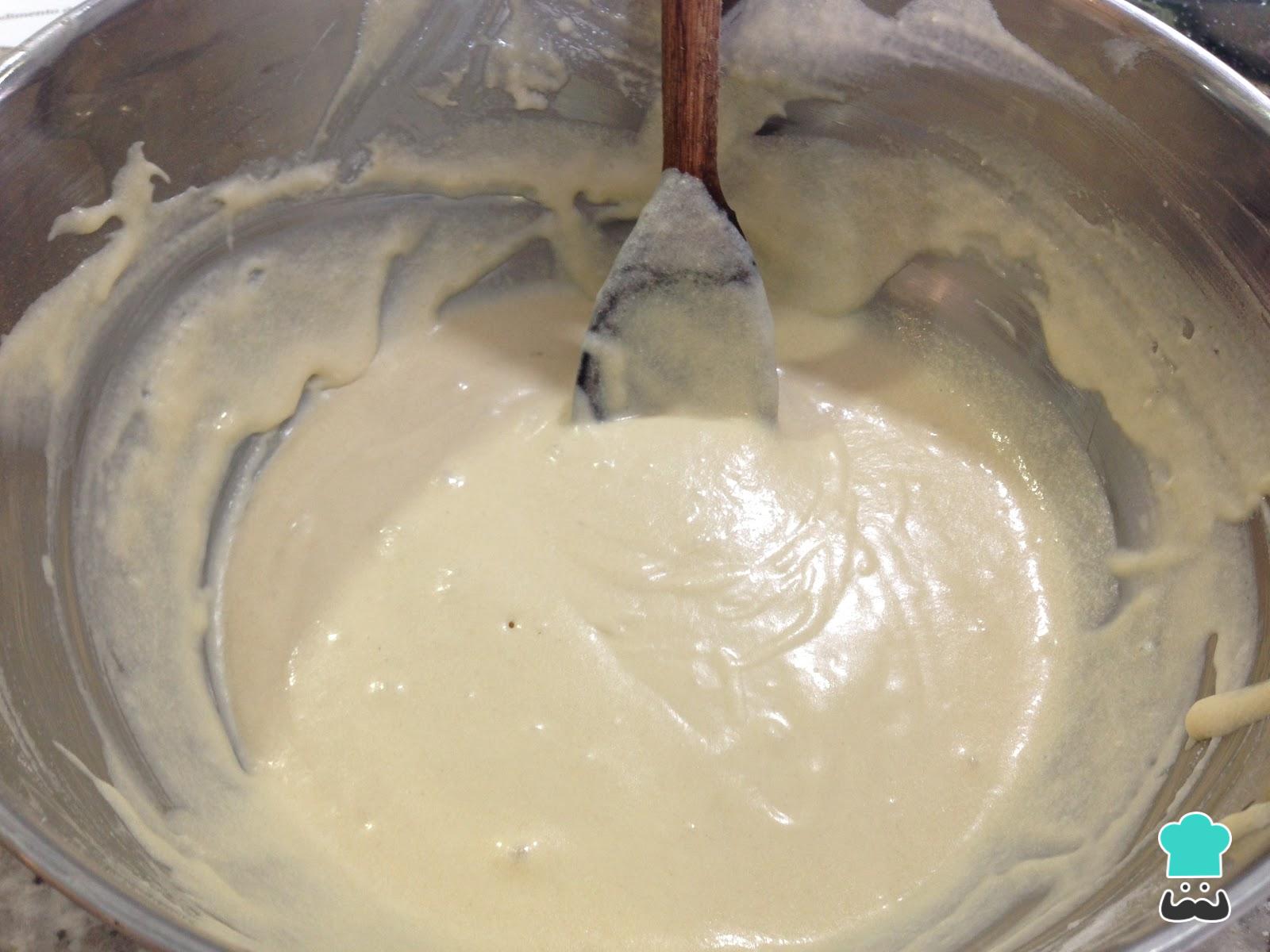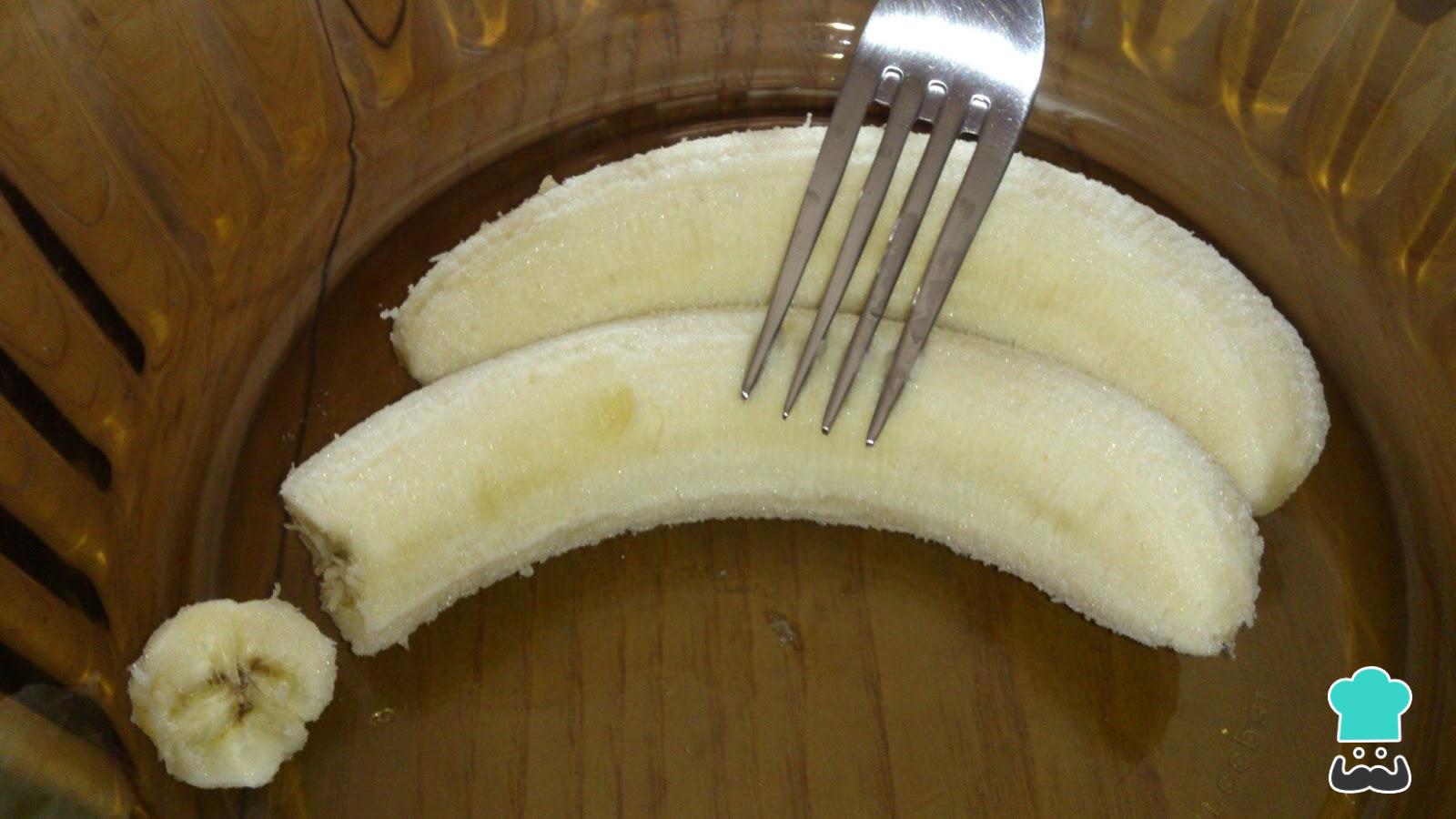 Para fazer este bolo de frigideira de banana comece por esmagar as bananas sem a casca e misturar com os líquidos em uma tigela.