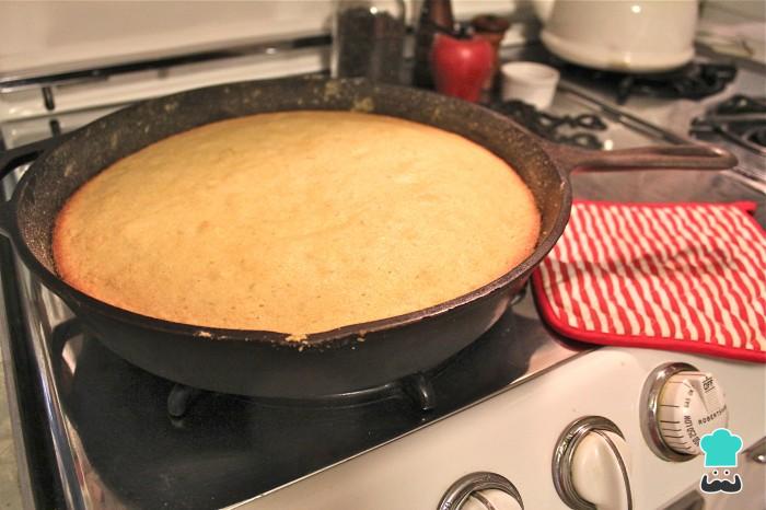 Verta a massa deste bolo fácil e rápido para uma frigideira grande e untada, em fogo baixo, e tampe. Espere 8-10 minutos, ou até a massa soltar do fundo da panela, e vire ao contrário com uma espátula. Deixe por mais 3-5 minutos.