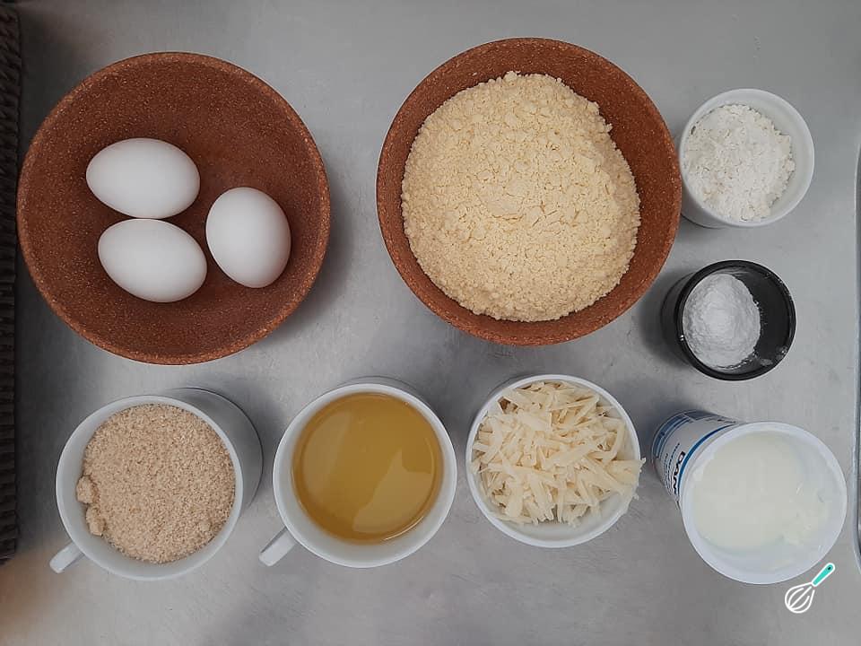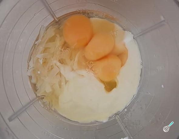 No liquidificador bata os ovos, o iogurte natural, o açúcar, o óleo e o queijo ralado até que fique bem liso.