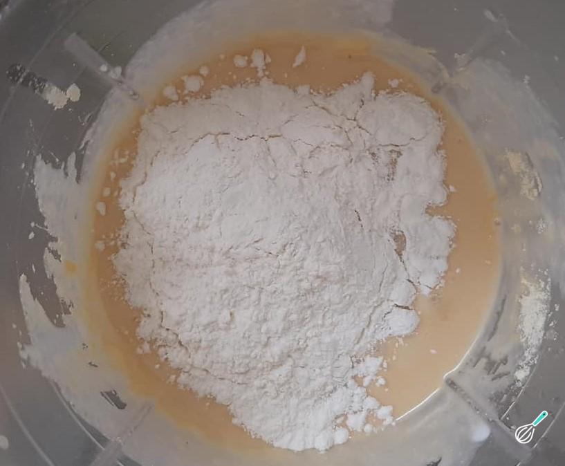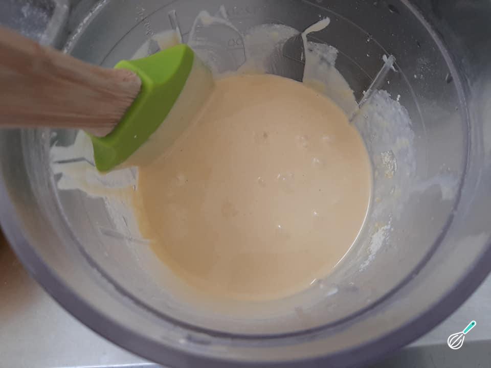 Por último, adicione o fermento e bata ligeiramente, apenas para incorporar à massa. Retire a massa que ficou no copo do liquidificador e bata até tudo ficar misturado de forma homogênea.