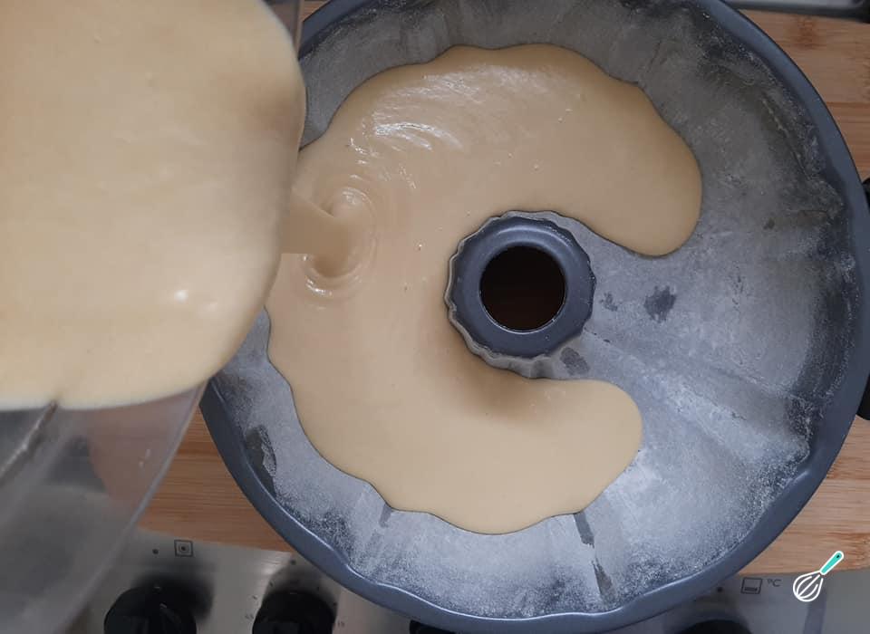 Despeje a massa numa forma untada e enfarinhada e leve o bolo para assar em forno pré aquecido a 180-200 graus por 30-35 minutos, ou até ficar dourado e passar pelo teste do palito.