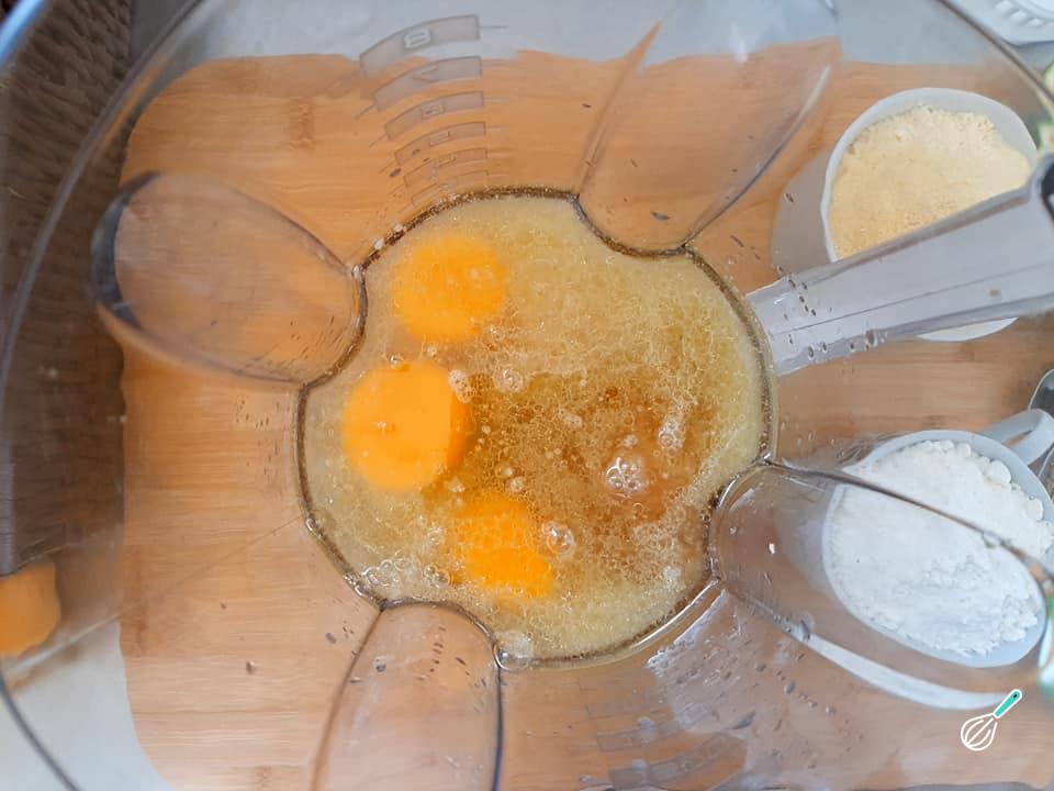 No liquidificador bata os ovos, o óleo, o açúcar e o suco de laranja por 3 minutos até que fique liso e uniforme.