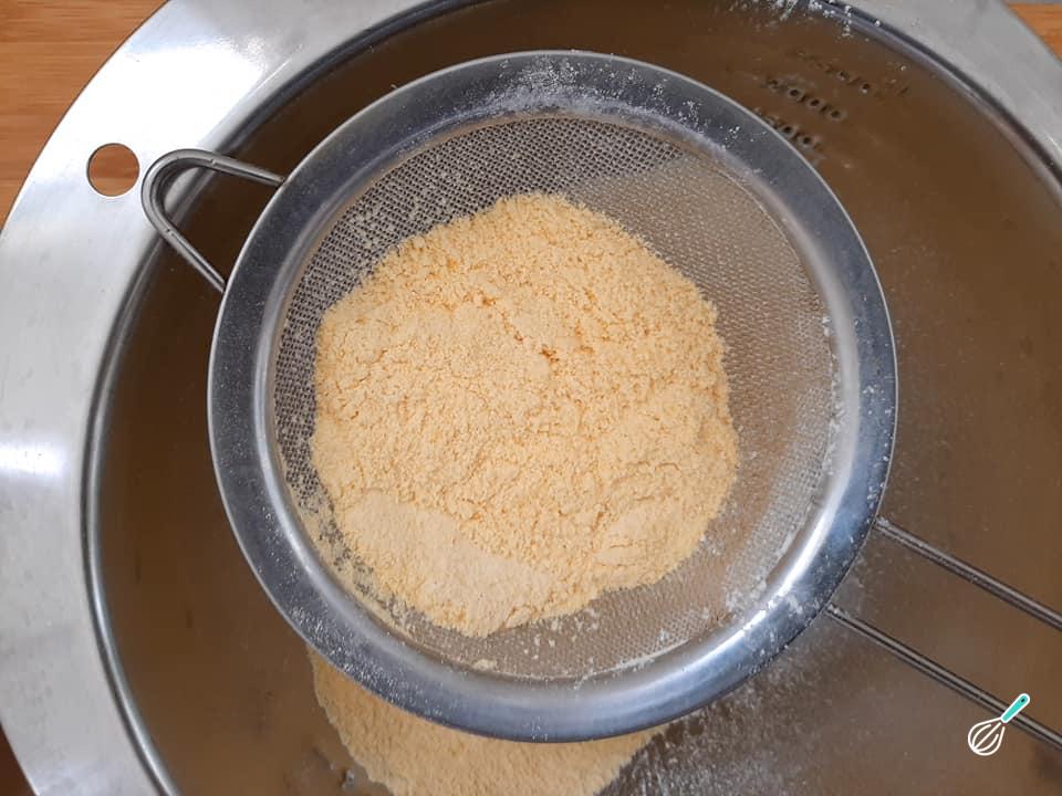 Em seguida, peneire o fubá e misture as duas farinhas com um fouet ou uma colher.
