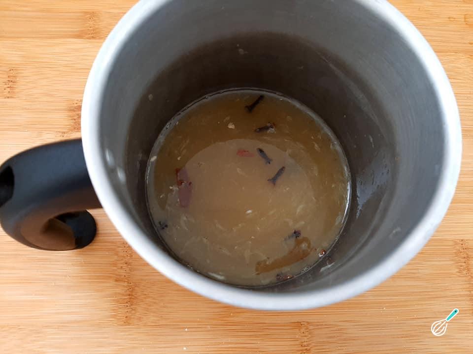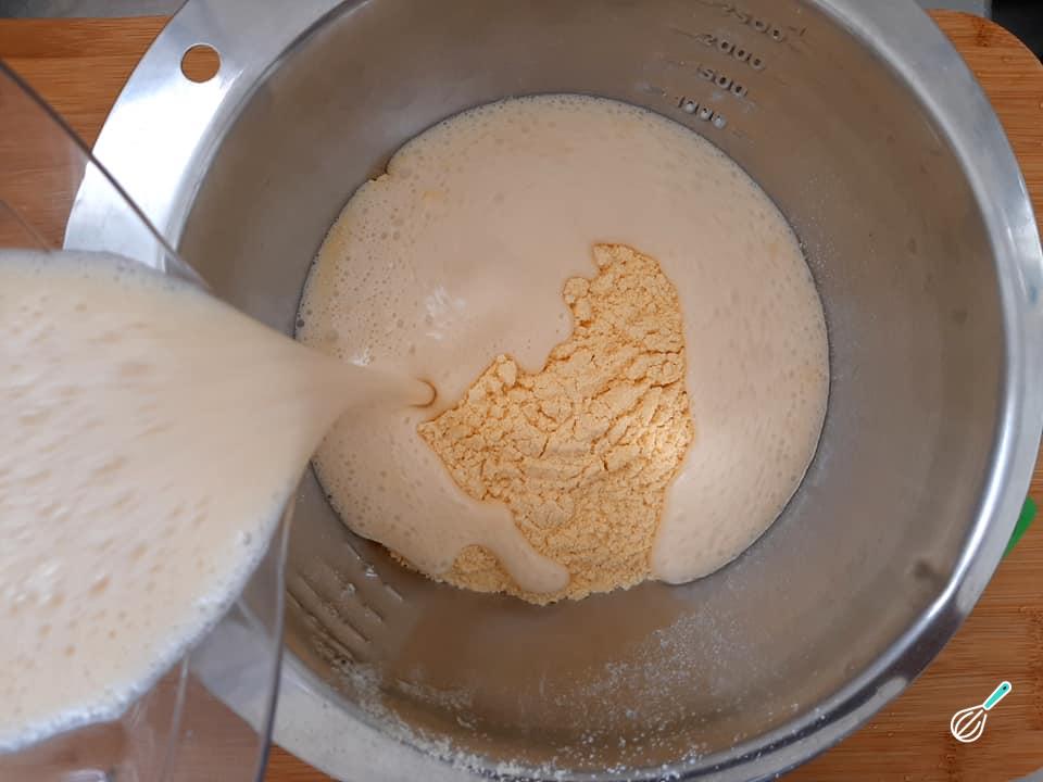 Adicione ao bowl o líquido batido e misture com um fouet até ficar bem homogêneo.