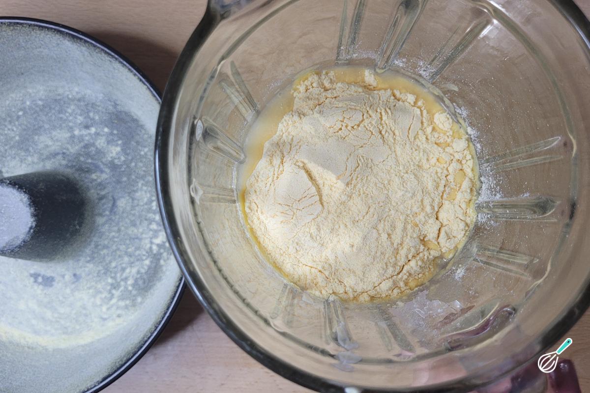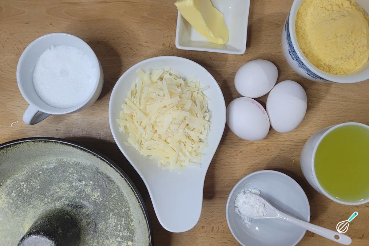 Separe os ingredientes para fazer seu bolo de fubá com queijo ralado no liquidificador. Aqui usei soro de leite que sobrou de um queijo caseiro. Essa é uma ótima ideia para aproveitar o soro do leite, mas você pode usar leite na mesma proporção.