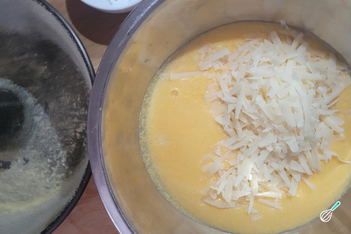 Bata até ter uma massa bem lisa e homogênea, transfira para uma tigela e adicione o queijo ralado.