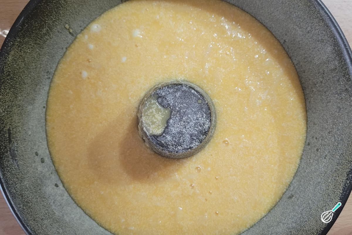 Transfira para uma forma untada e enfarinhada (aqui usei manteiga e fubá para untar) e leve ao forno pré-aquecido a 180oC por uns 40 minutos ou faça o teste com uma faca ou palito para ver quando o bolo está assado.