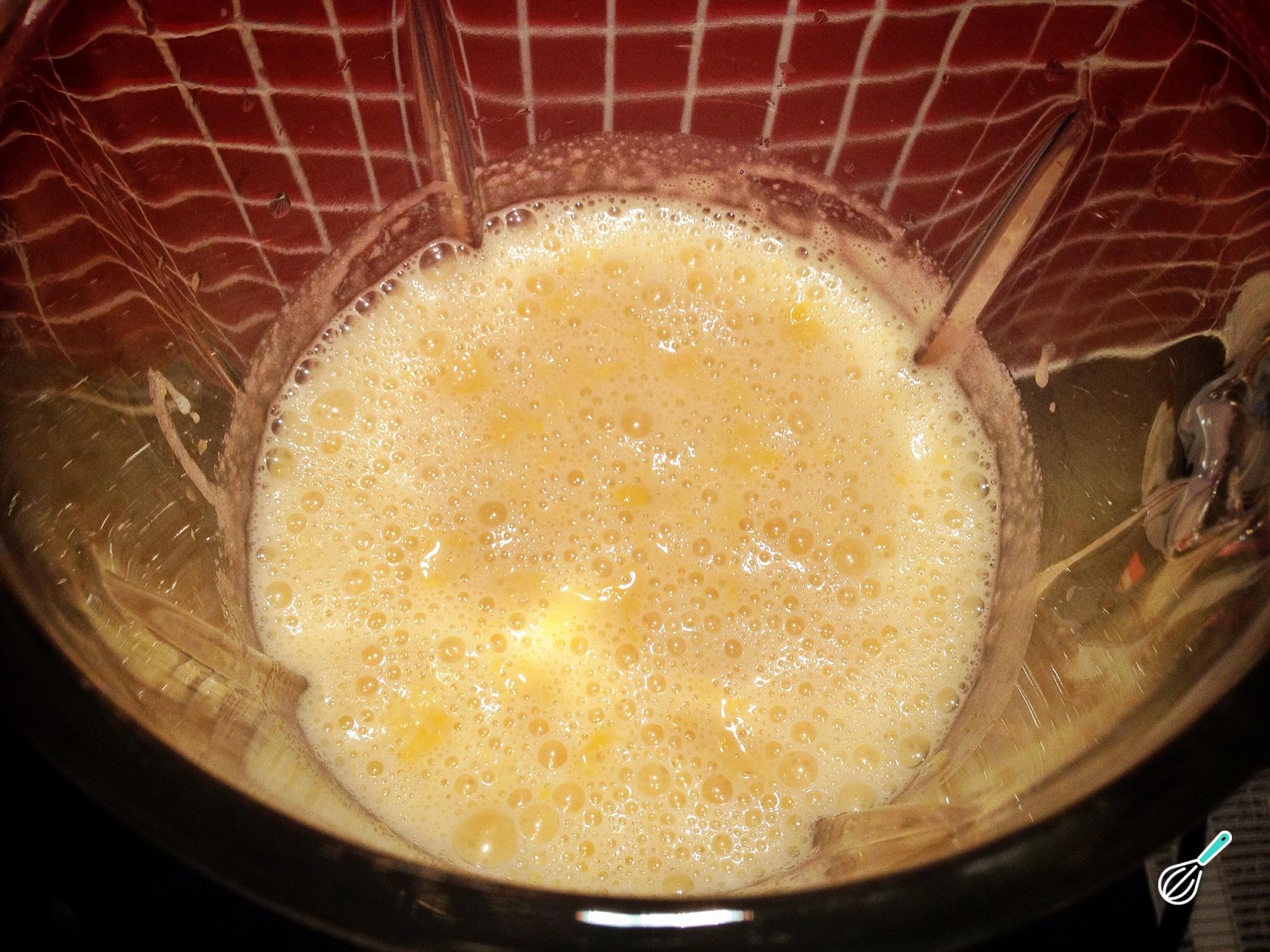 O primeiro passo desta receita funcional é separar as claras das gemas, e bater as gemas no liquidificador junto com o açúcar, o leite de coco e o creme de leite de soja.