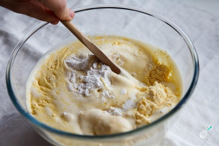 Coloque a mistura do liquidificador em uma vasilha, acrescente as farinhas e o fermento e misture. Bata as claras em ponto neve com a ajuda da batedeira elétrica, adicione a essência de baunilha e incorpore delicadamente na massa do bolo, para não perder o ar.