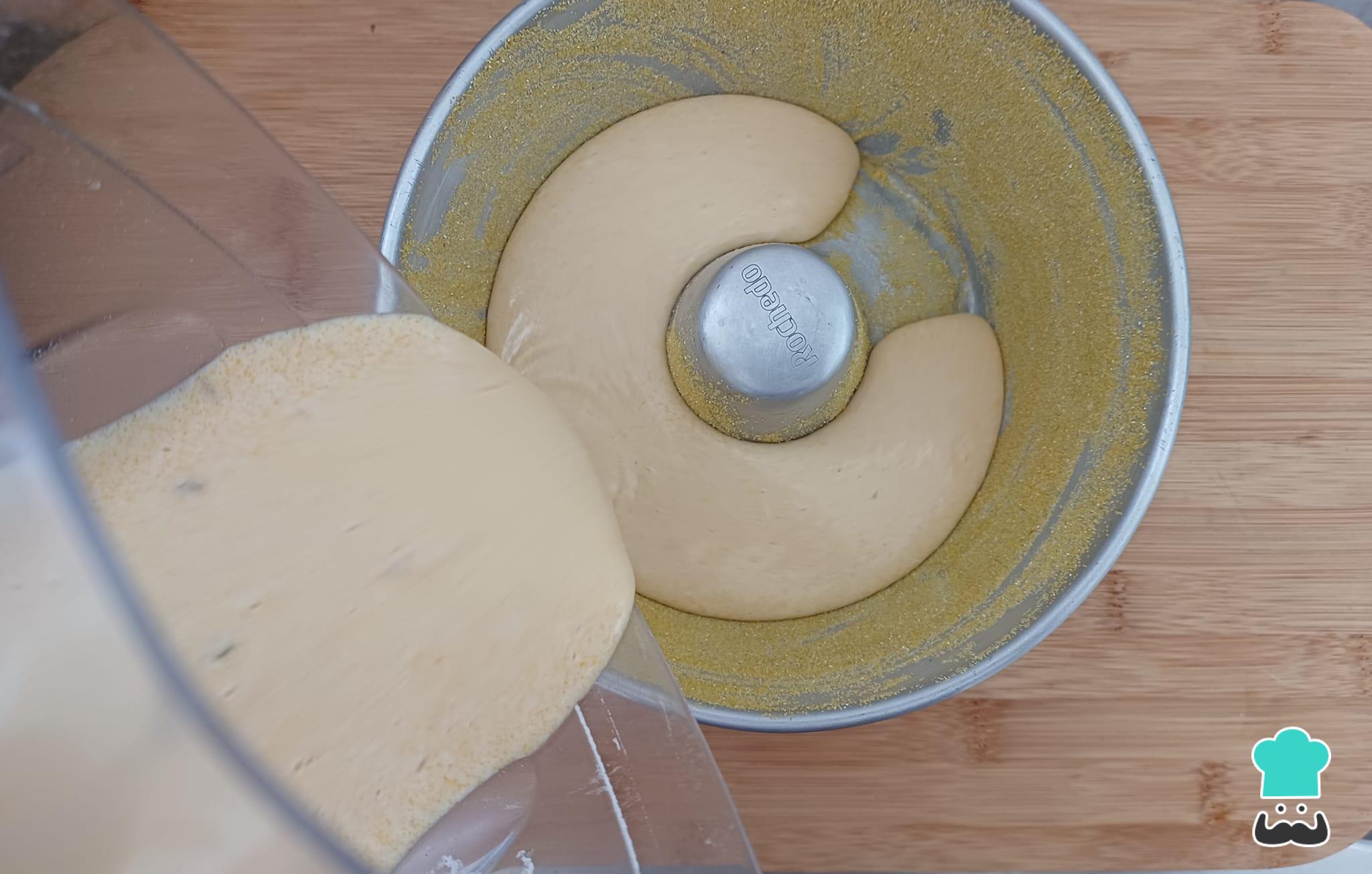 Transfira a massa para uma forma untada com manteiga ou óleo e polvilhada com fubá.
