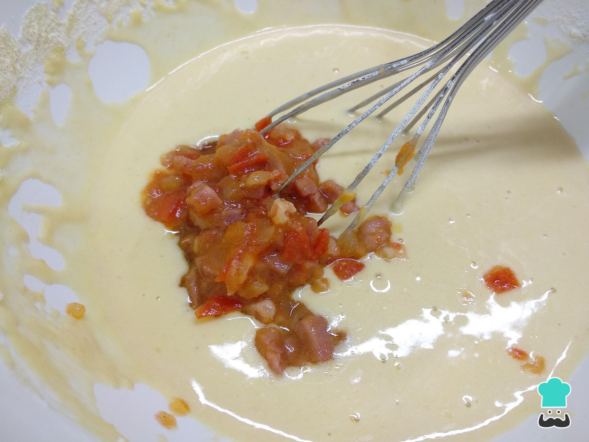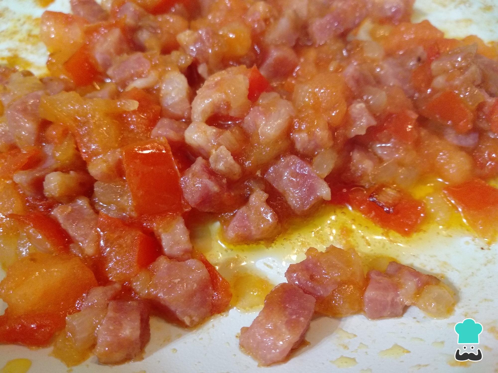 Em seguida, adicione o recheio de bacon, tomate e cebola, que já deverá estar frio ou, pelo menos, amornado.