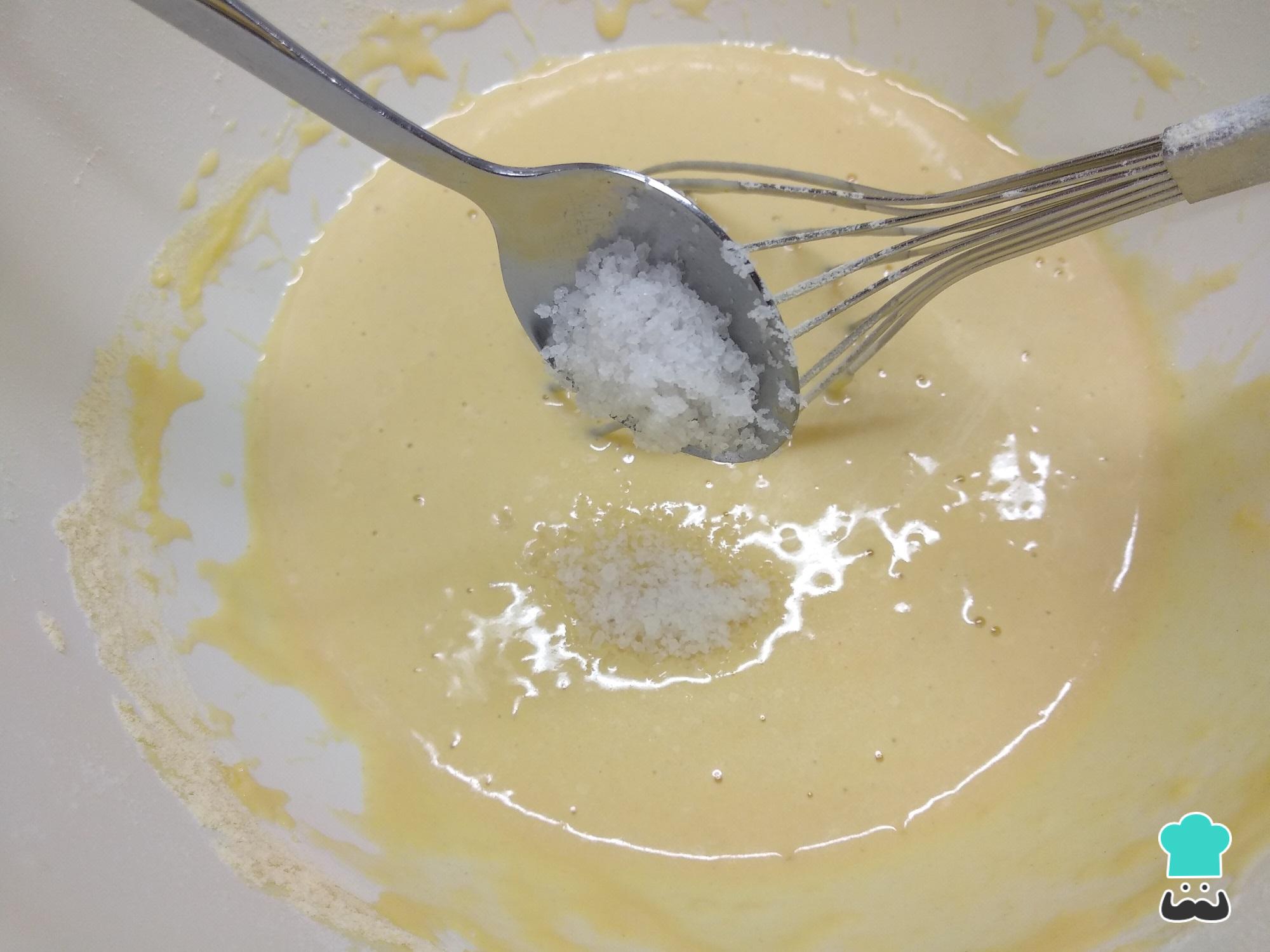 Em seguida, adicione o fermento e misture até envolver bem. Por fim, adicione o sal e volte a misturar.