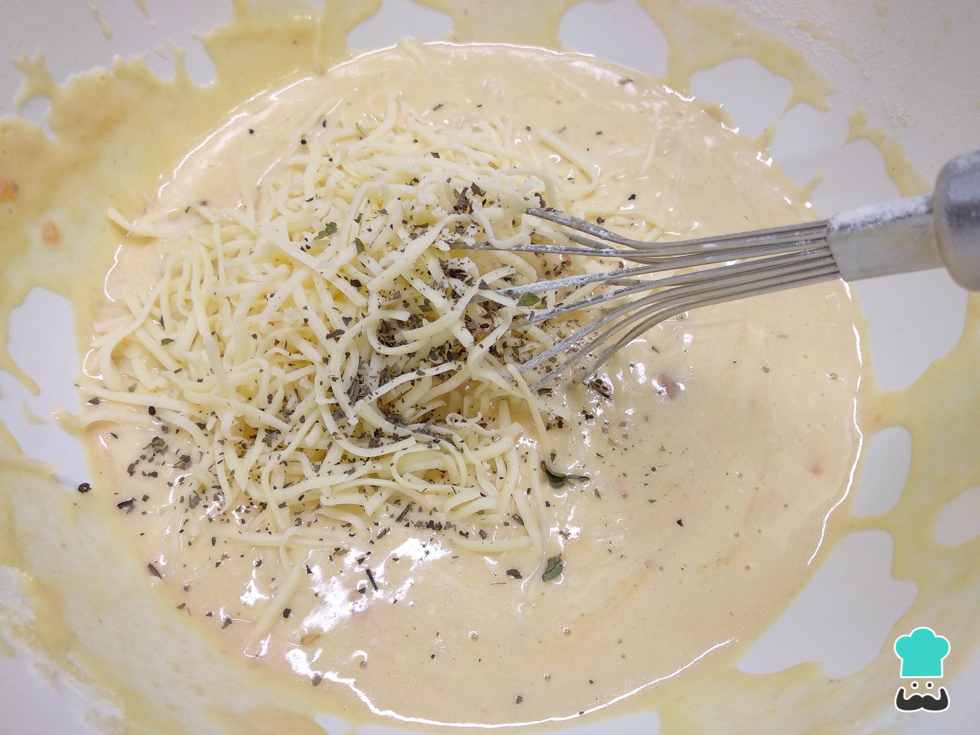 Por fim, adicione o queijo ralado e o orégano, e misture até incorporar bem na massa deste bolo de fubá salgado.