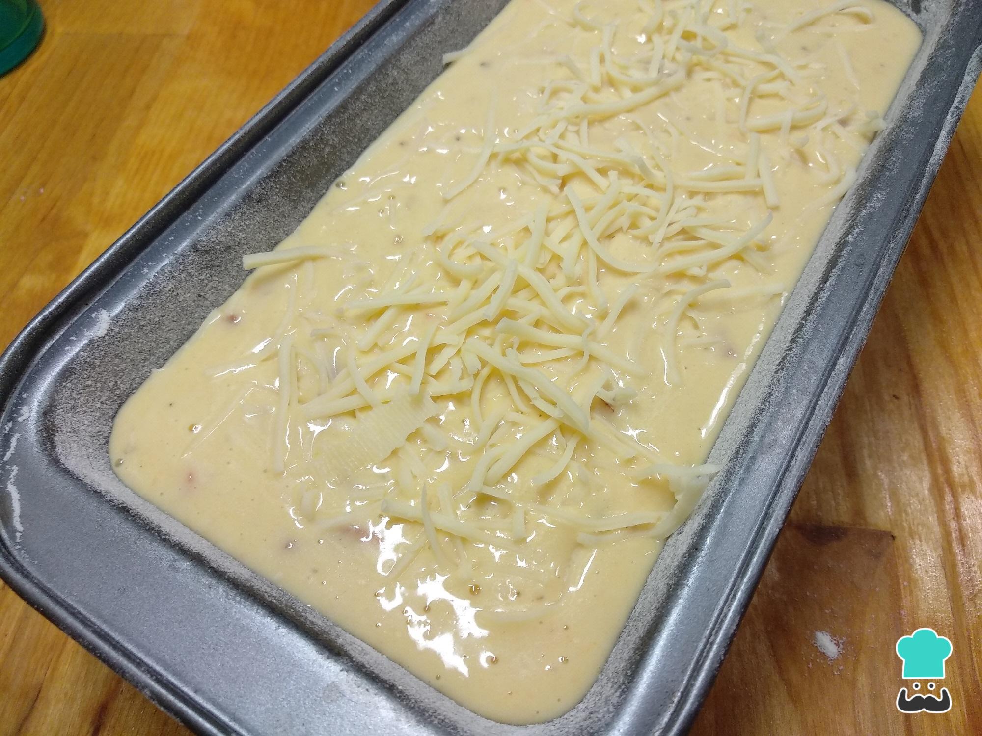 Coloque a massa numa forma de bolo média untada com óleo e polvilhada com farinha ou, faça como eu e divida por duas forminhas menores, também untadas e enfarinhadas. Decore o bolinho com queijo ralado para que fique douradinho após assar.