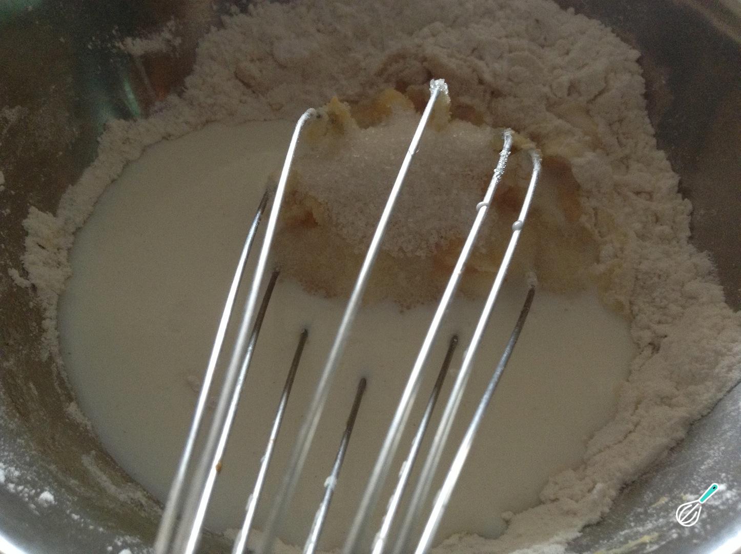 Seguidamente acrescente o açúcar e o leite, misture e finalmente adicione o óleo ou a manteiga. Misture tudo muito bem, até obter uma massa homogênea.