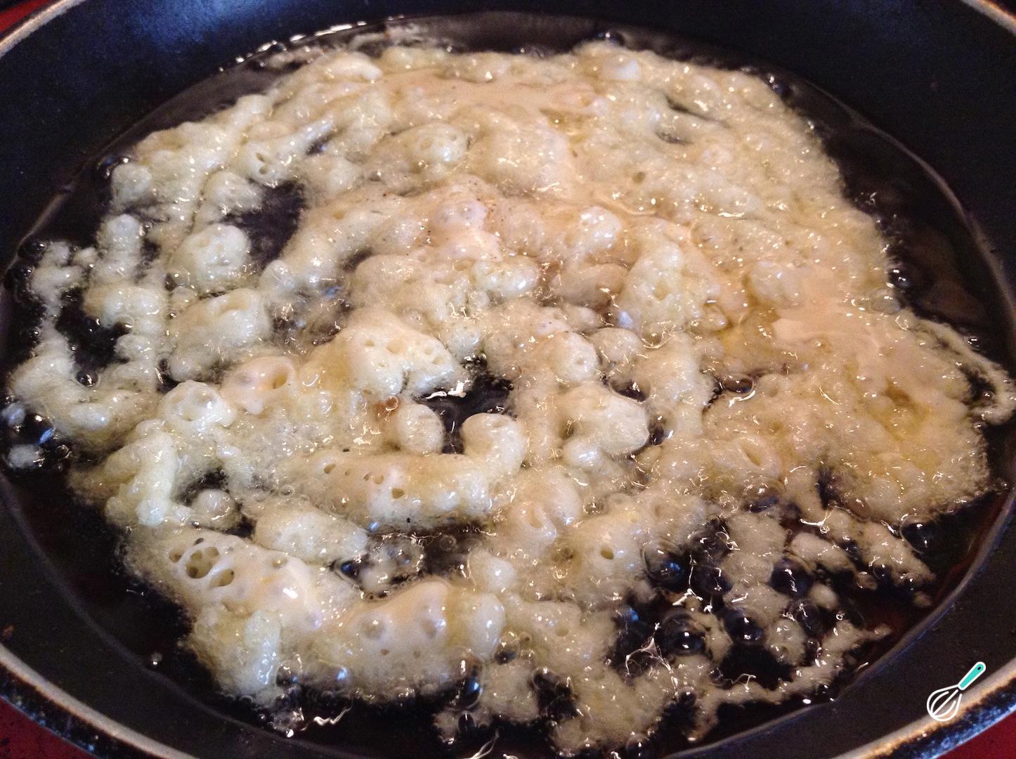 Quando o óleo estiver quente, adicione a massaatravés do funil, do saco de confeiteiro ou do frasco para molhos, espalhando aleatoriamente em forma de teia.
