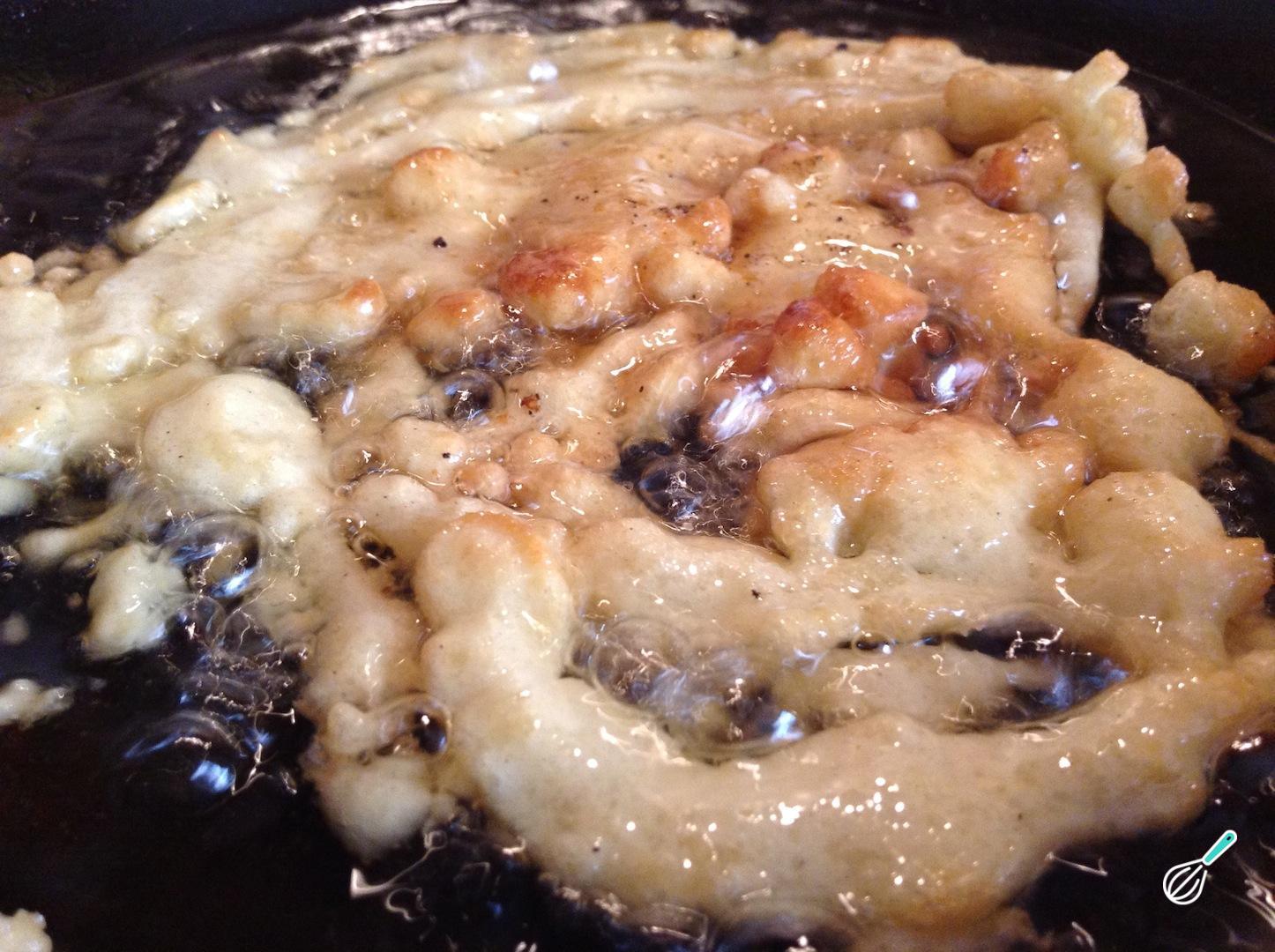 Quando a massa de bolo de funil estiver mais consistente, vire ao contrário para fritar do outro lado também.
