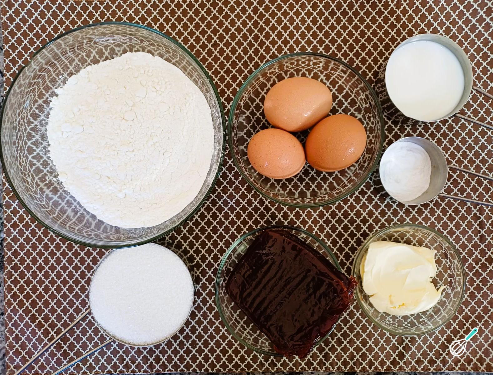 Comece separando os ingredientes para o preparo do bolo de goiabada.