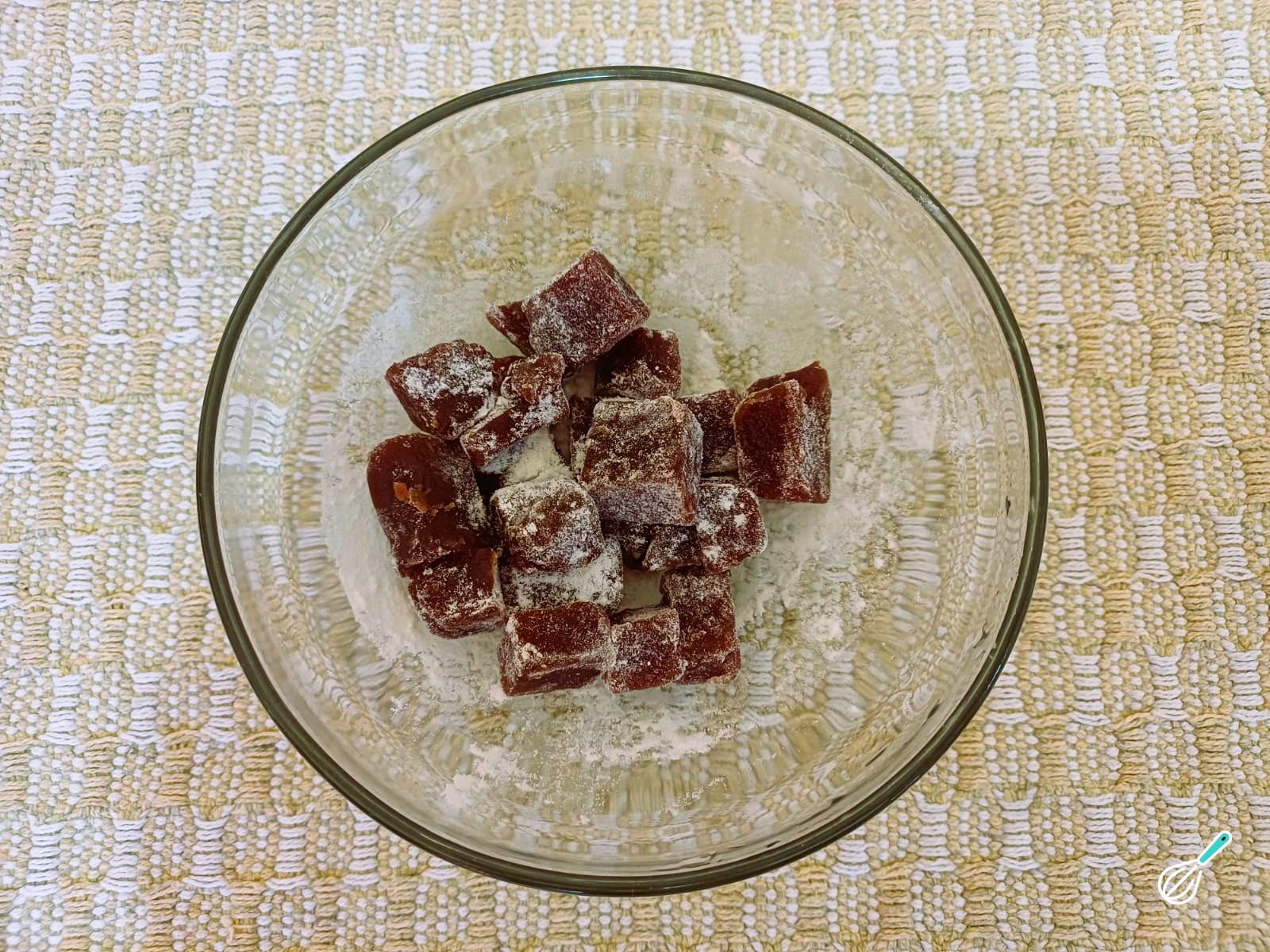Prepare a goiabada, corte-a em cubos pequenos, e passe pela farinha de trigo e peneire para retirar o excesso.