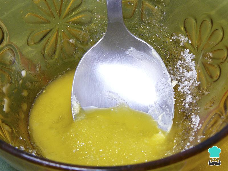 Para derreter a manteiga, coloque-a no microondas e aqueça durante 10 segundos na potência máxima. Assim que estiver totalmente derretida, despeje o açúcar e misture bem.
