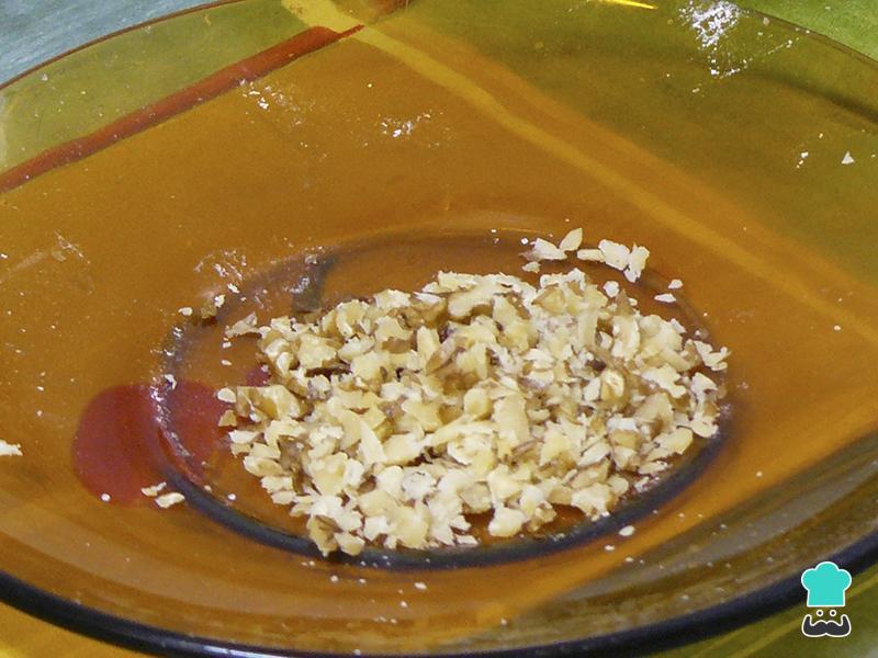 Enquanto deixa a massa do bolo de caneca repousar alguns minutos, pique as nozes que vai usar para acompanhar o bolo de iogurte.