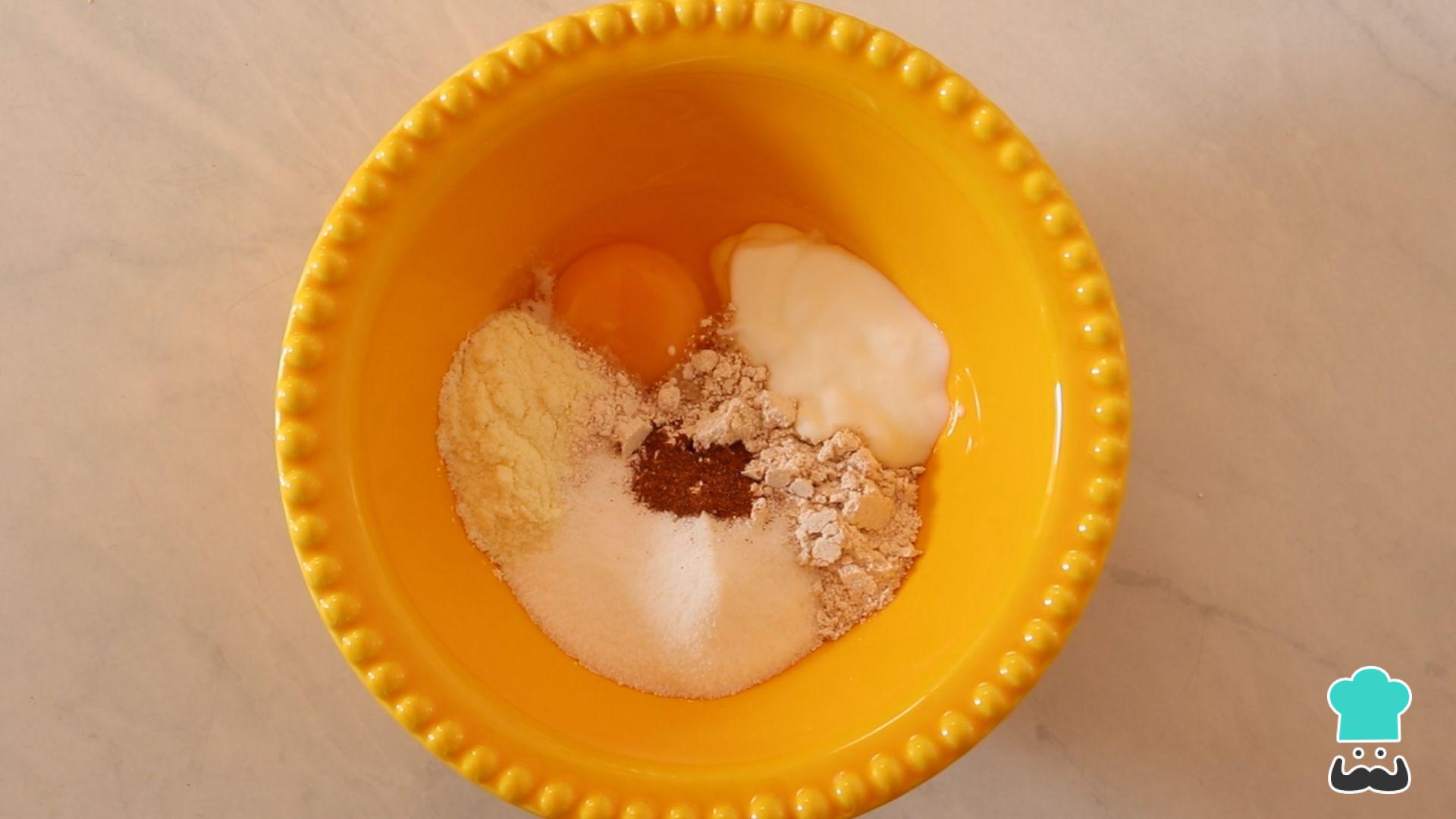 Coloque todos os ingredientes em uma tigela, exceto o fermento. Esse bolo será mais leve que os bolos tradicionais por causa da presença do iogurte!