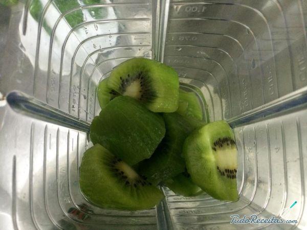 Comece o seu bolo de kiwi de liquidificador, juntando todos os ingredientes necessários. Num liquidificador, junte todos os ingredientes líquidos, um kiwi e deixe bater bem.