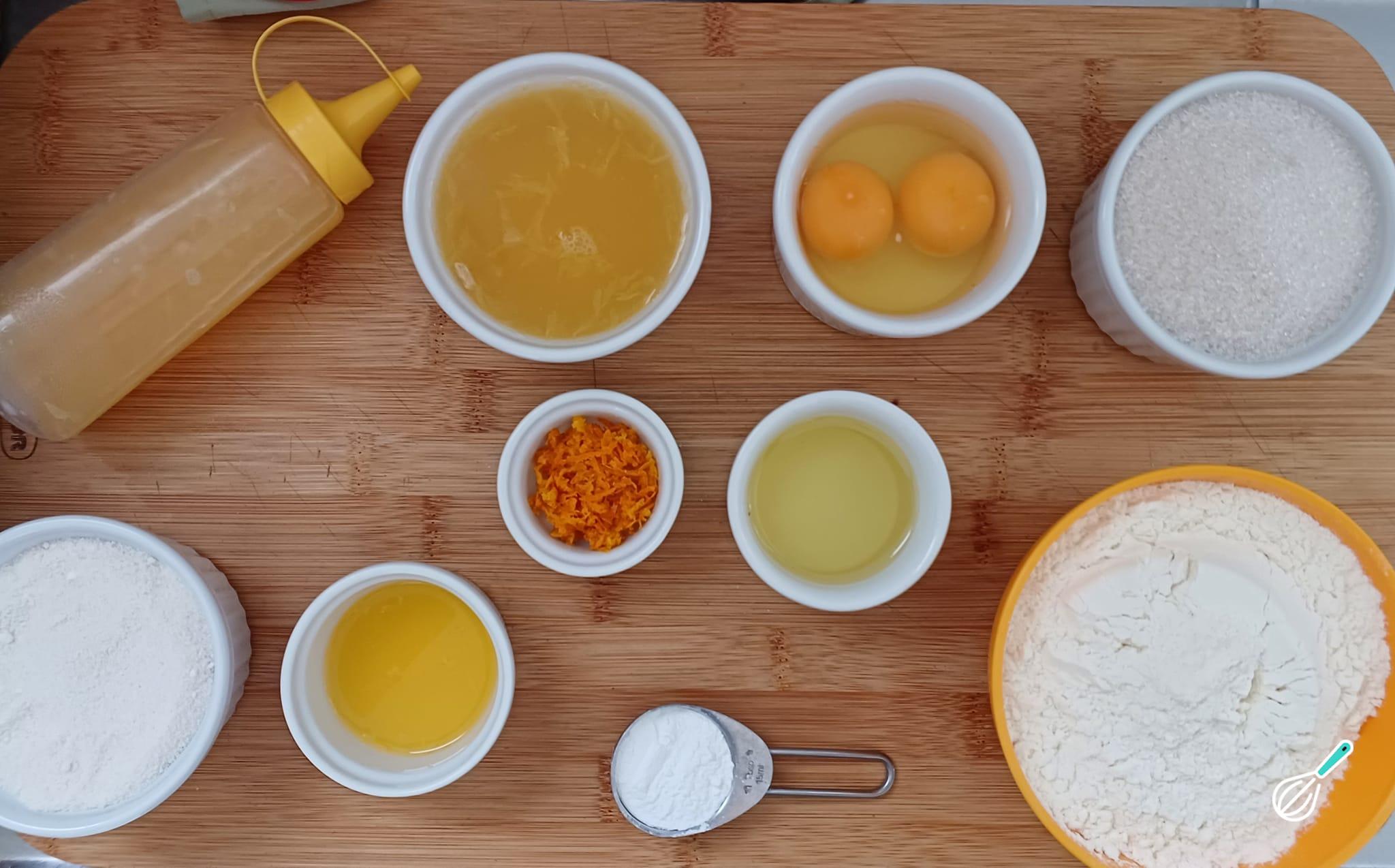Separe todos os ingredientes necessários para preparar o bolo de laranja com calda açucarada.