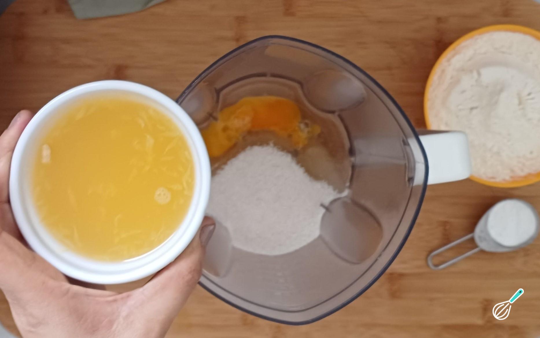 No liquidificador, bata os ovos, o açúcar, o óleo e o suco de laranja até formar uma mistura homogênea.