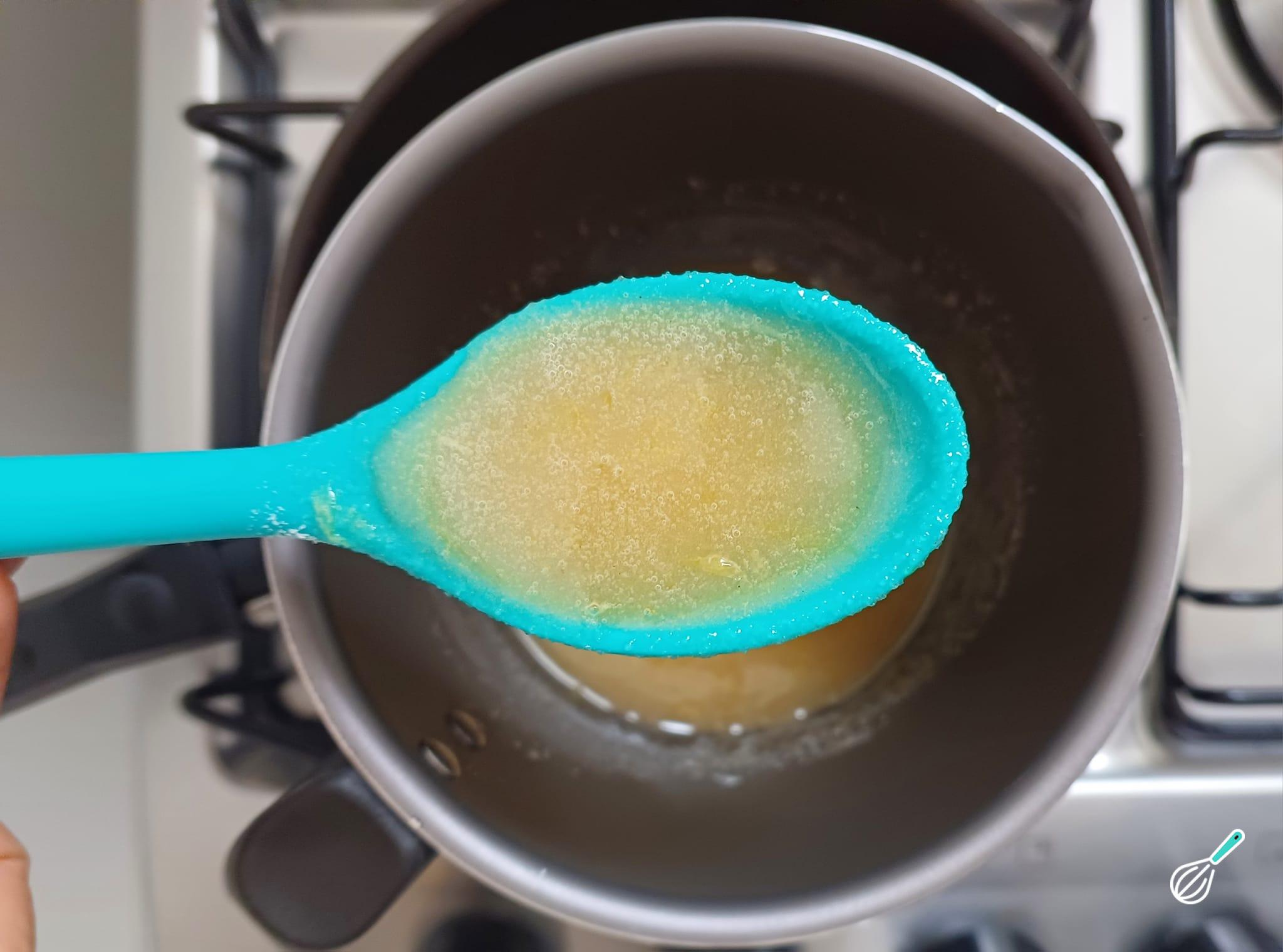 Prepare a calda açucarada levando para aquecer em banho-maria o açúcar de confeiteiro com o suco de laranja, mexendo de vez em quando, por cerca de 3 a 5 minutos ou até a calda engrossar levemente e reduzir um pouco.