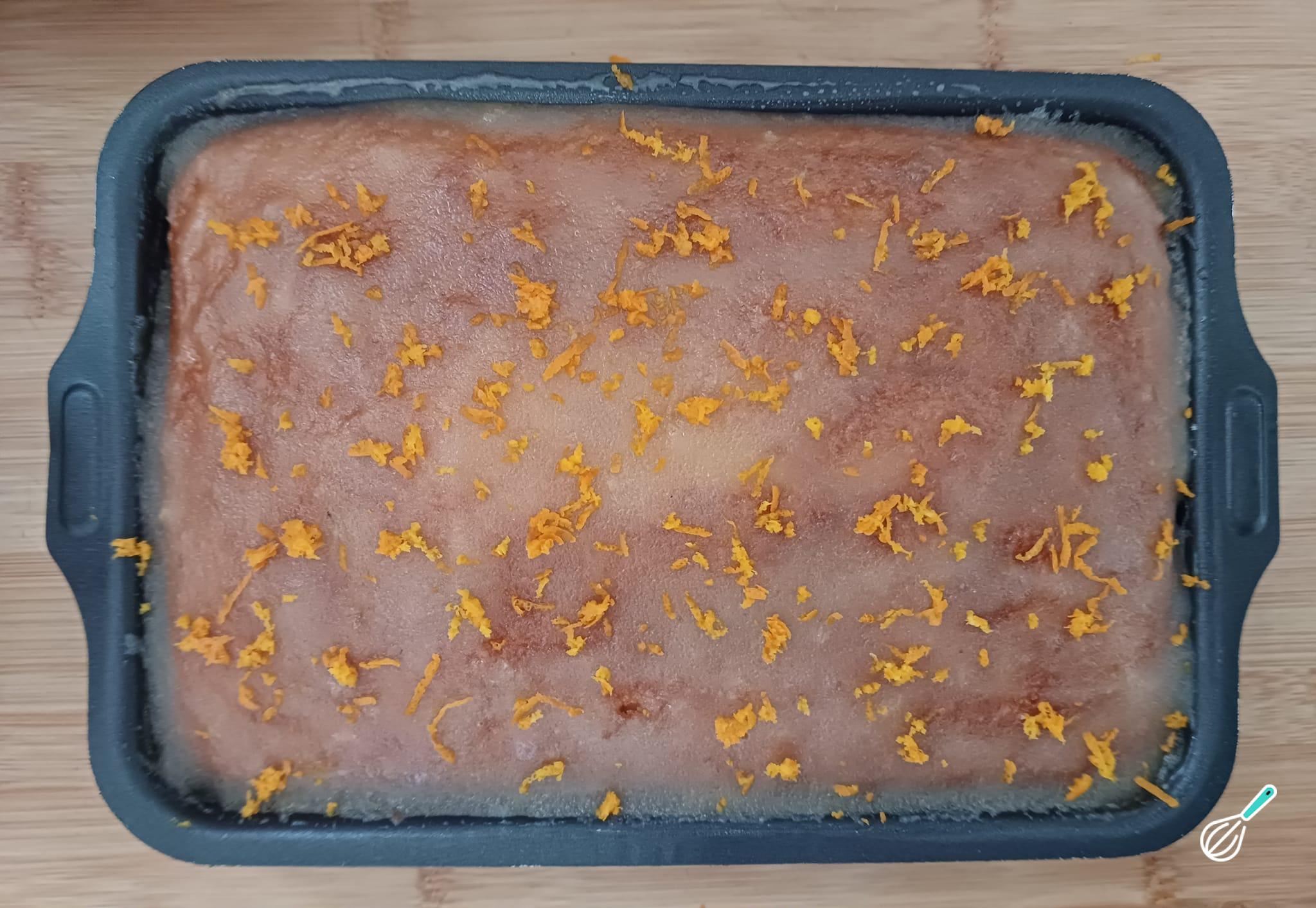 Com a calda açucarada ainda quente, cubra todo o bolo e decore com raspas de casca de laranja.