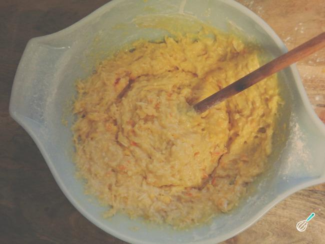 Coloque o líquido batido em uma tigela e acrescente a farinha, as raspas da laranja, o fermento, e o açúcar. Misture tudo.
