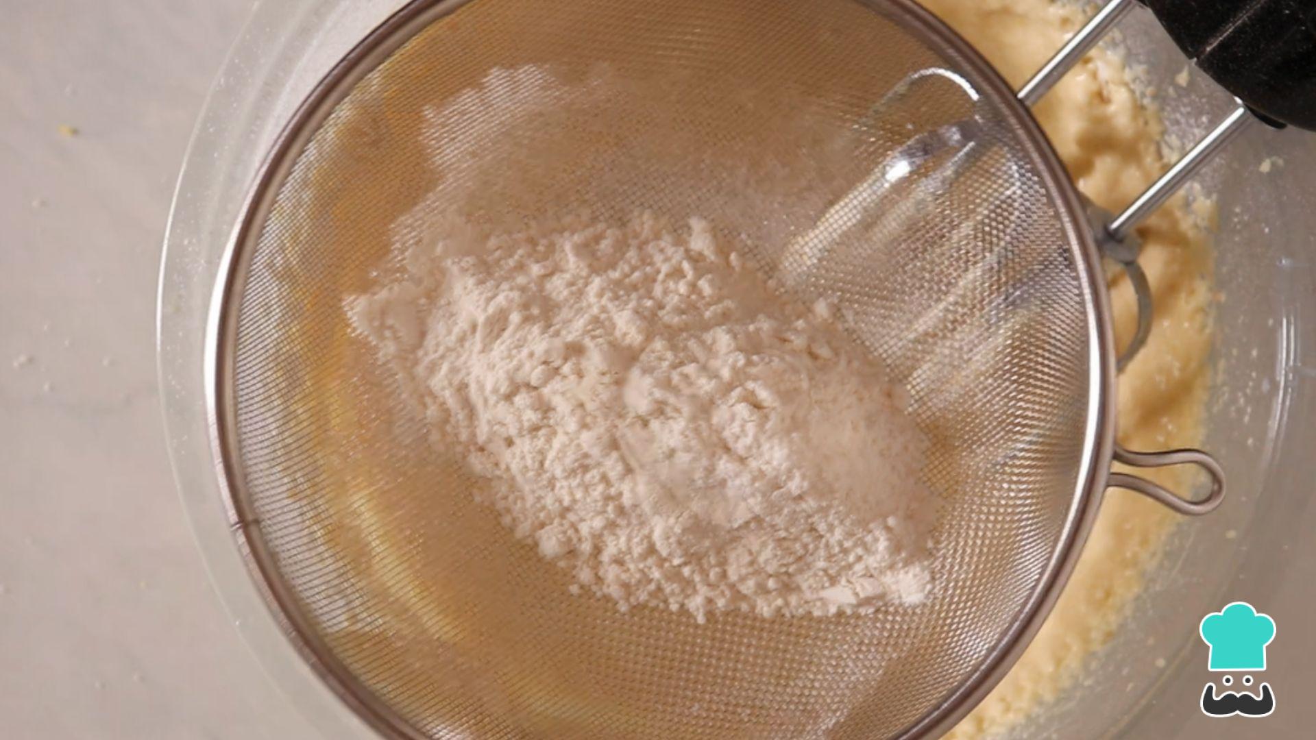 Agora junte os ingredientes secos (farinha, fermento e sal) passando por uma peneira e bata só até incorporar.