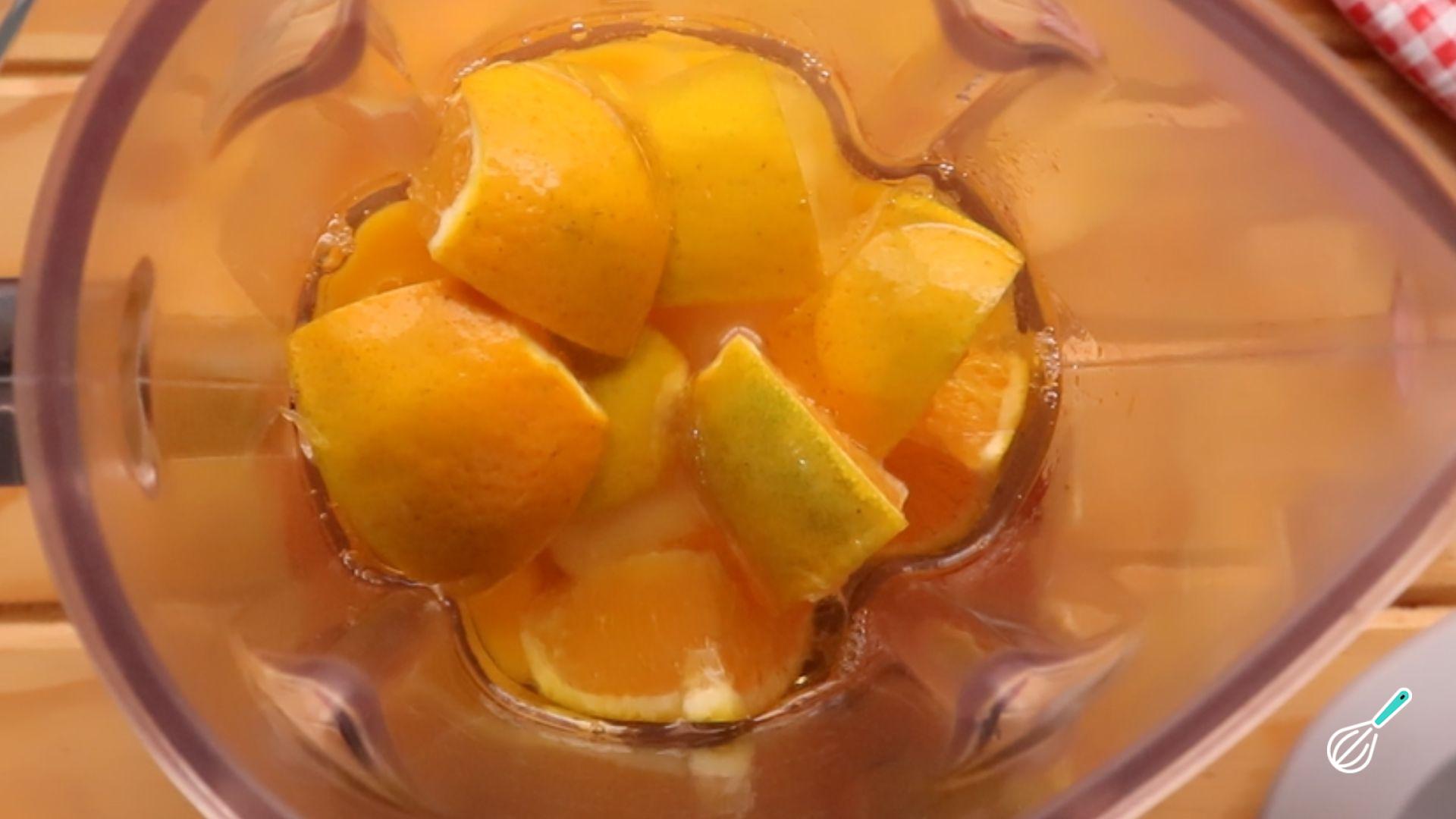 Lave bem e corte a laranja em 4 partes, tirando as sementes e o miolo branco. Bata bem no liquidificador com o óleo, o açúcar e os ovos.