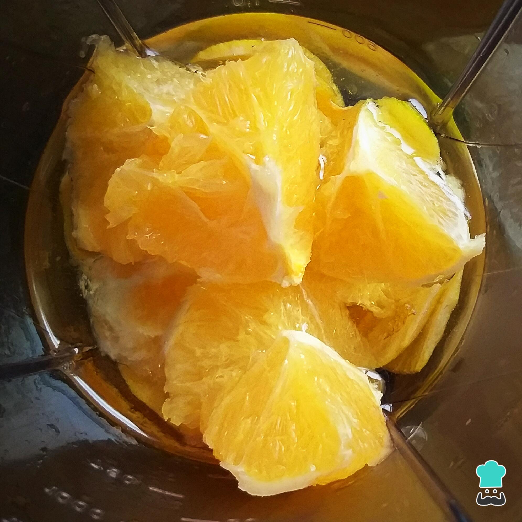 Bata no liquidificador a laranja com a sua casca, o óleo e os ovos até obter uma mistura lisinha. Reserve.