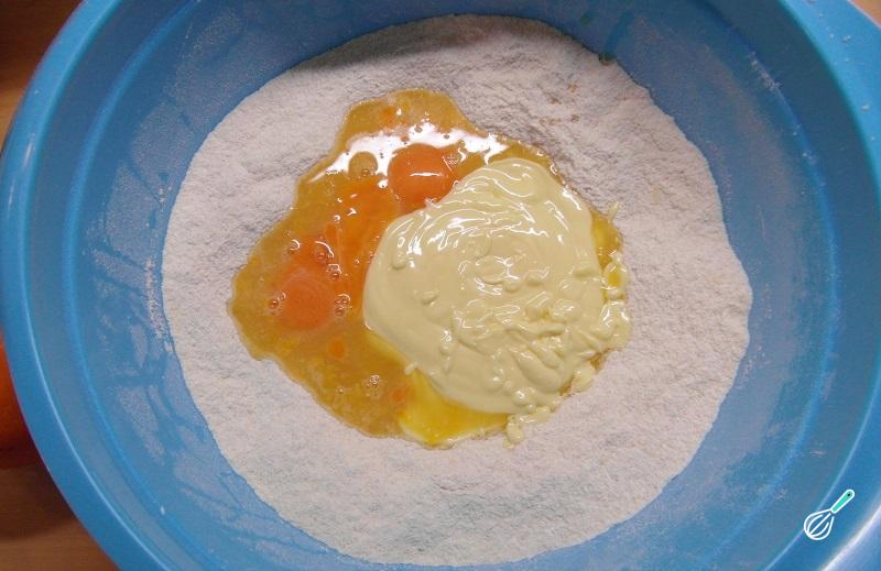 De seguida abra uma cova no meio e junte aí o suco de laranja, as gemas de ovo e a manteiga. Envolva delicadamente com um batedor de claras, do centro para fora, e quando obtiver uma mistura homogênea mexa muito bem.