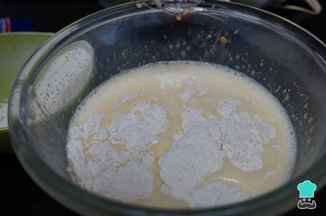 Peneire a farinha junto com o fermento e vá adicionado a mistura na tigela com a massa de bolo de laranja enquanto mexe lentamente.