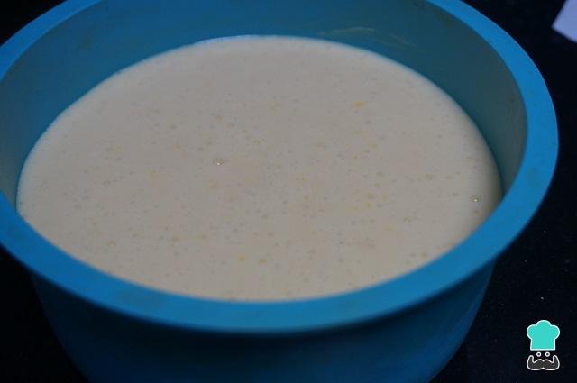 Coloque a massa de bolo de laranja em uma forma adequada para microondas e previamente untada com um pouco de manteiga.