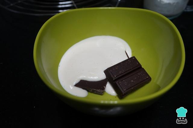Prepare a cobertura de chocolate: coloque o chocolate e o creme de leite em uma tigela e leve ao microondas por dois minutos e misture bem.