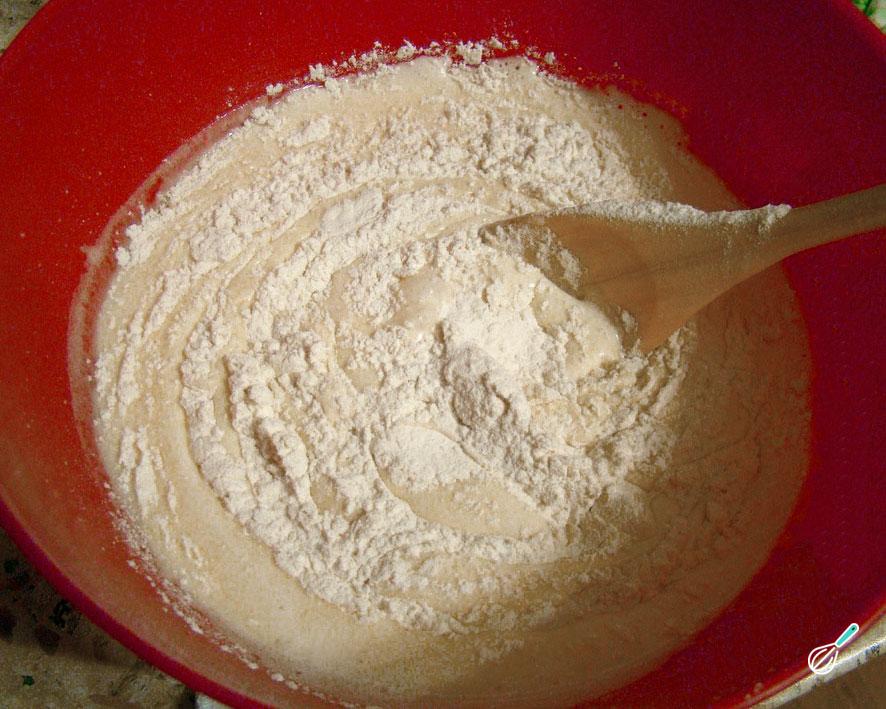 Coloque a farinha peneirada numa tigela, adicione a mistura do liquidificador e misture muito bem. Adicione as claras e envolva delicadamente com uma colher ou espátula, para que não percam o ar. Por fim coloque o fermento e misture somente até incorporar.