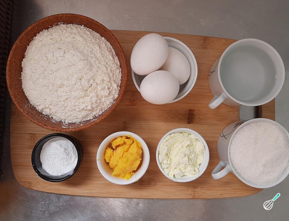 Separe os ingredientes necessários para preparar a massa do bolo de leite Ninho. Utilize os ingredientes em temperatura ambiente para garantir que o bolo asse perfeitamente.