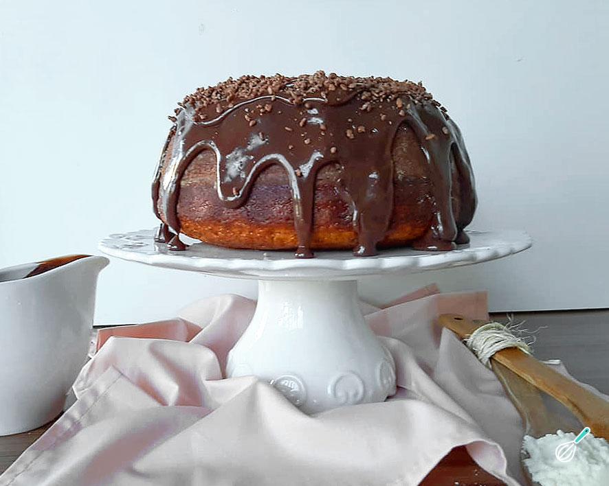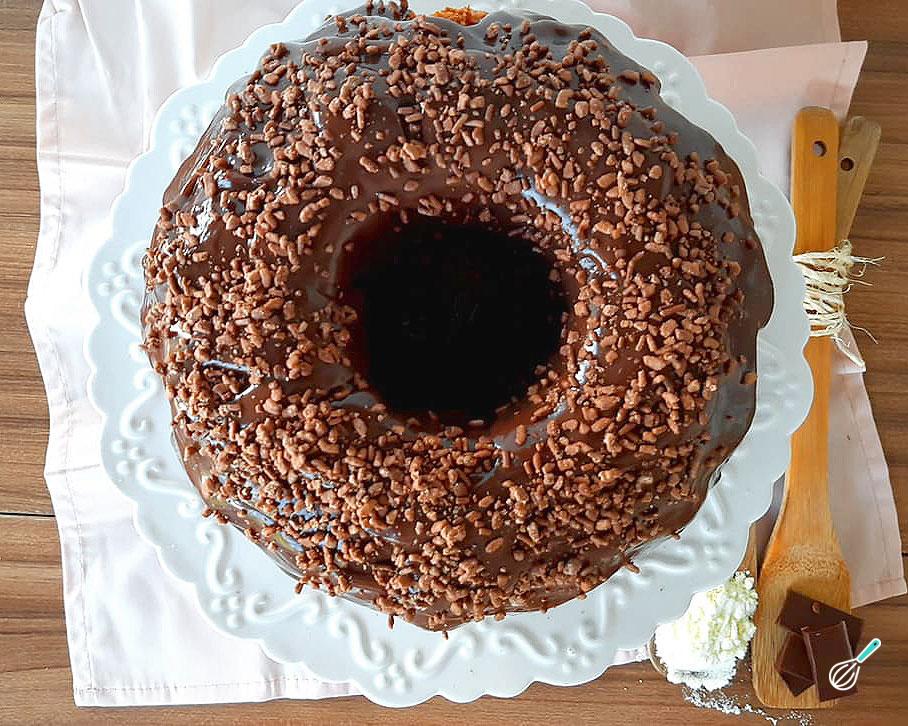 Desenforme o bolo num prato de servir e regue com a cobertura de chocolate. Decore com chocolate granulado ou raspas de chocolate.