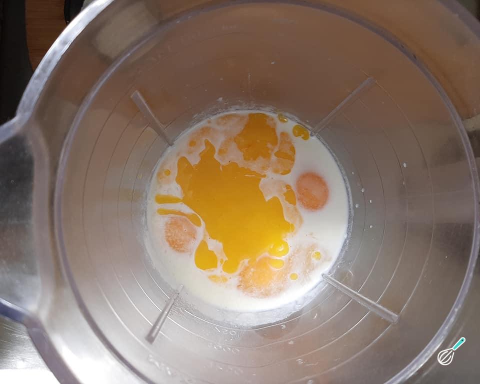 No liquidificador bata os ovos com a manteiga em temperatura ambiente, o açúcar, o leite em pó e a água, até misturar bem.