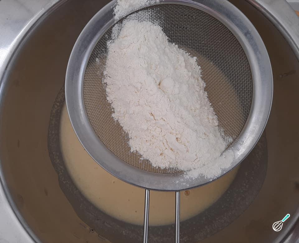 Despeje o líquido preparado anteriormente num bowl e acrescente a farinha de trigo peneirada, misturando tudo com um fouet até que a massa fique lisa e homogênea.