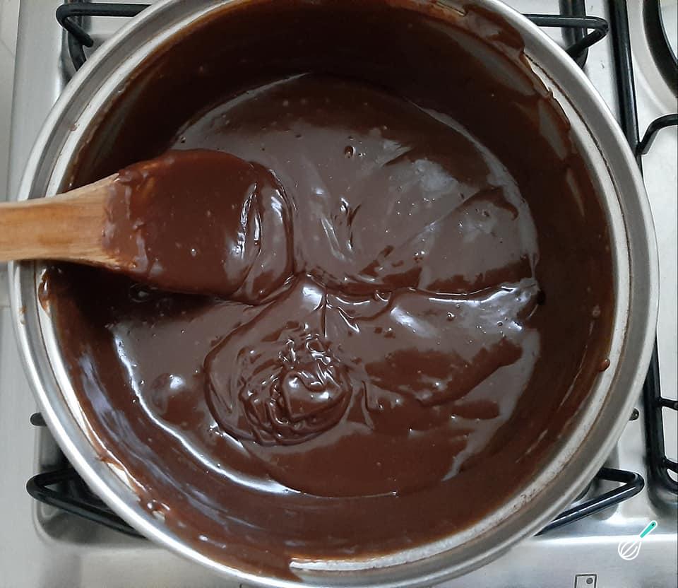 Desligue o fogo e junte o chocolate em barra picado, misturando bem até que ele derreta completamente, como mostra a foto abaixo.
