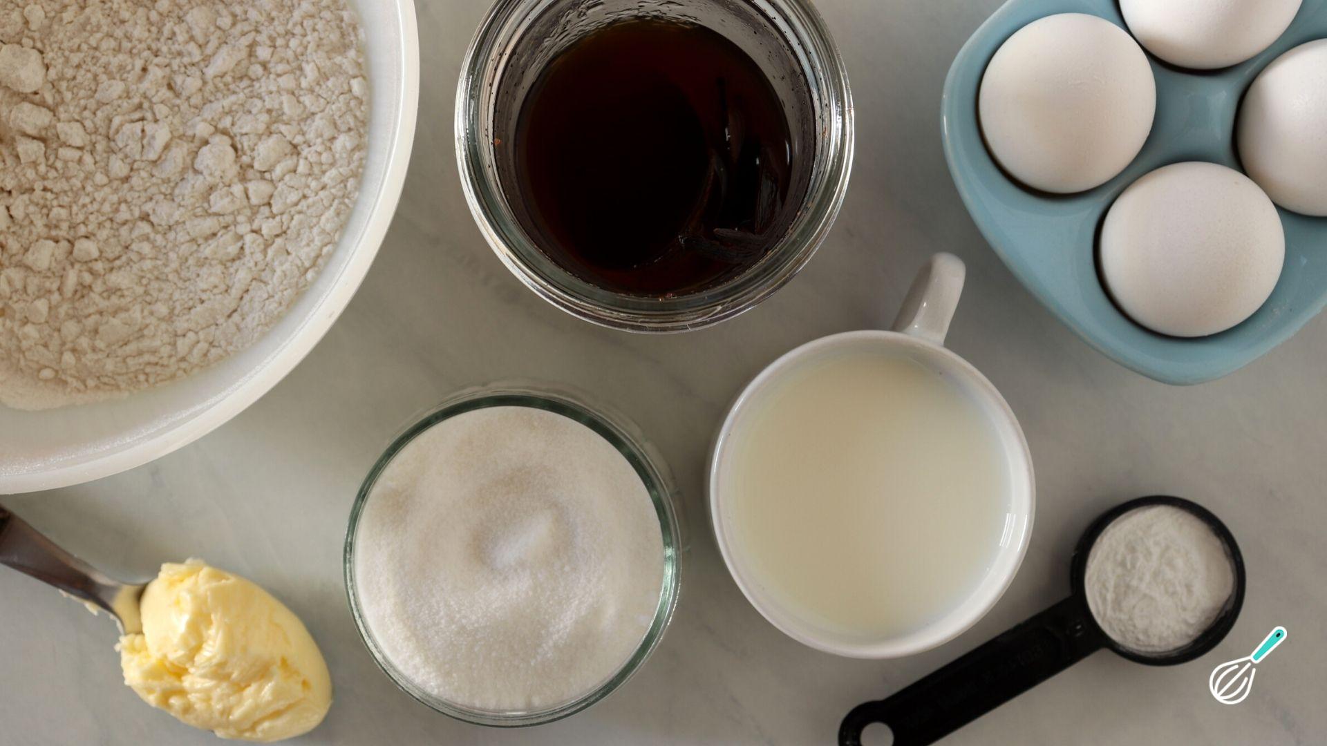 Separe os ingredientes. Peneire a farinha e o açúcar. Os ovos e a manteiga devem estar em temperatura ambiente.