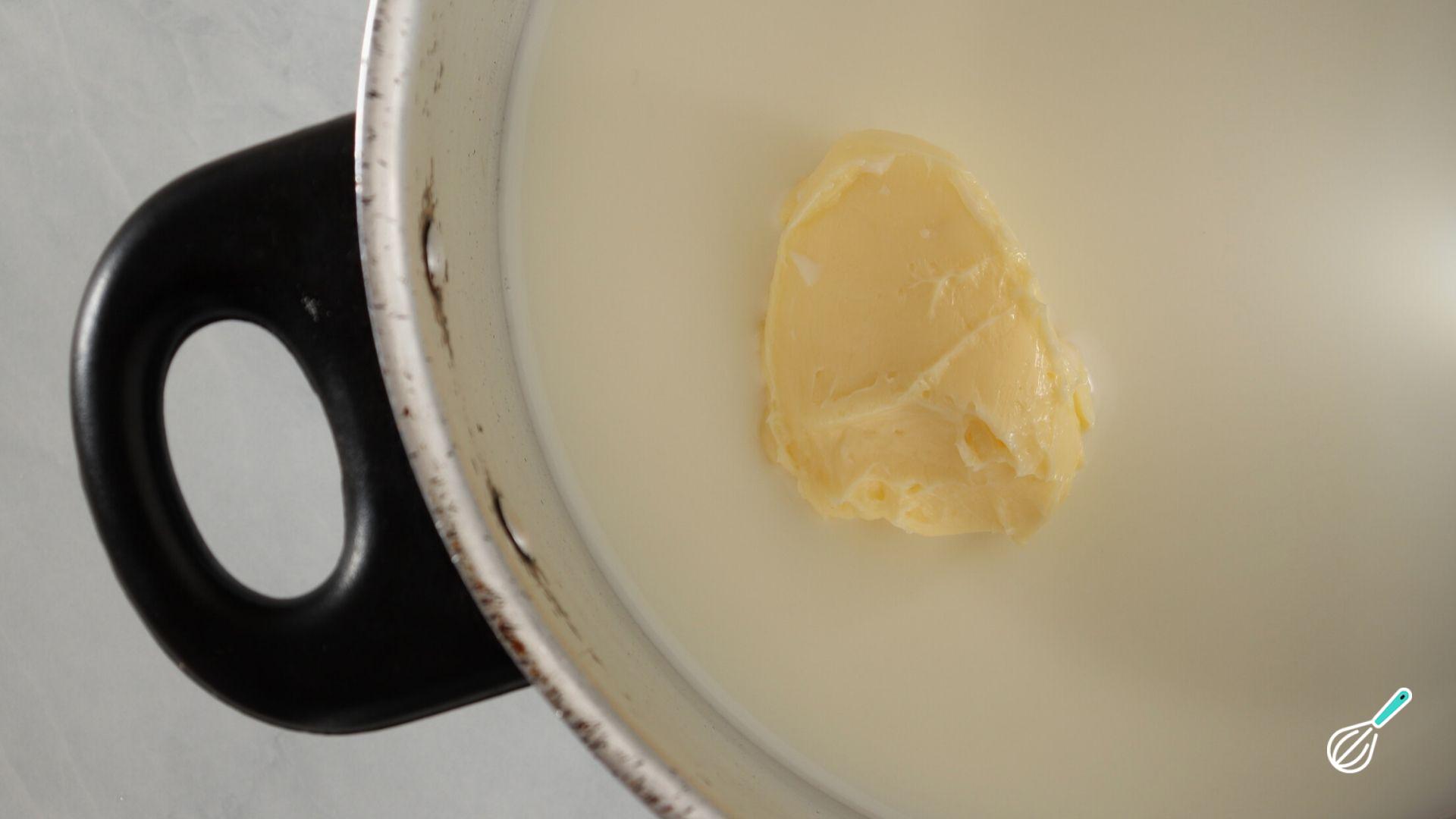 Comece colocando o leite e a manteiga em uma panela e leve para ferver. Reserve.