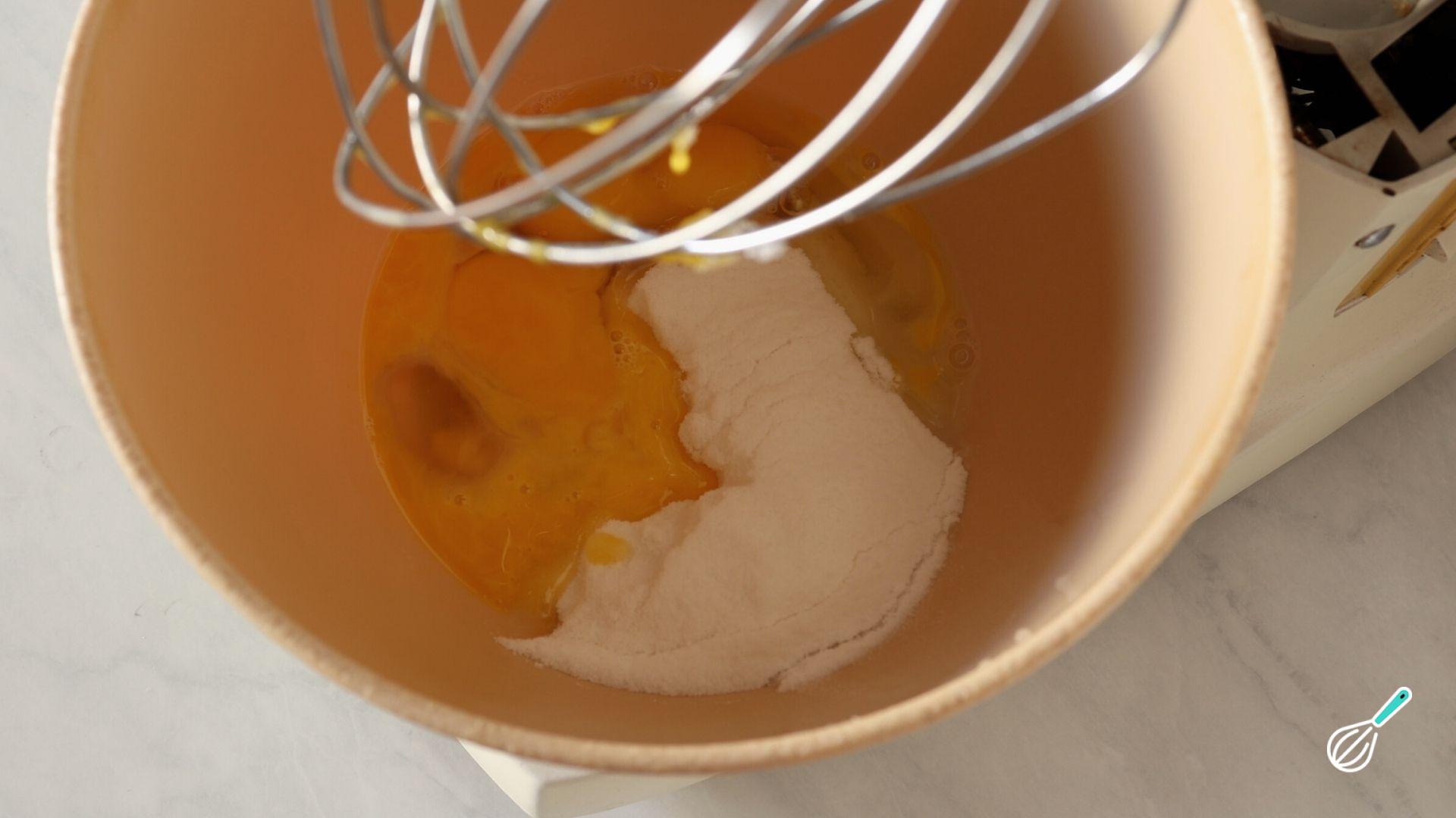 Em uma batedeira misture os ovos com o açúcar até ficar bem clarinho e fofo.